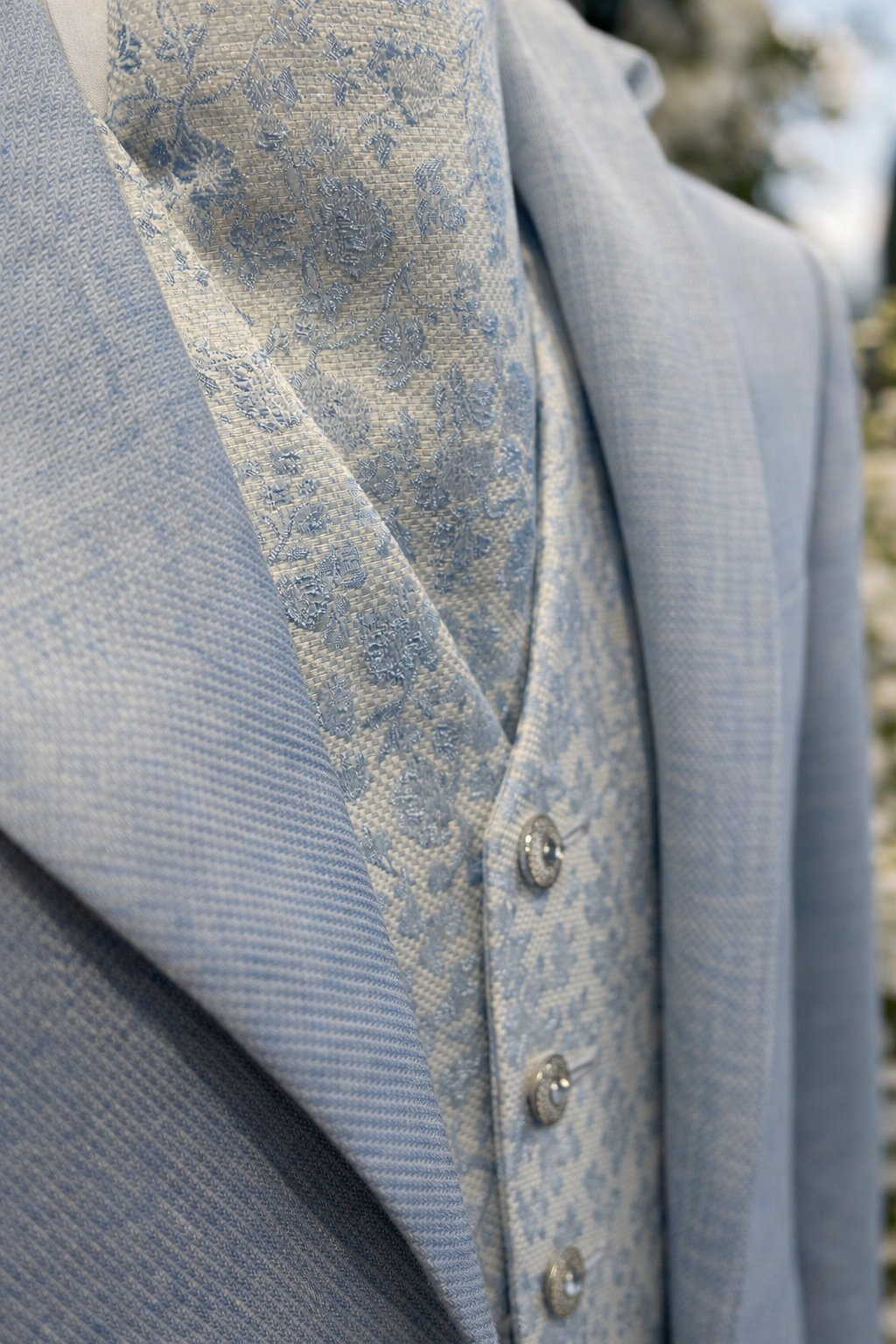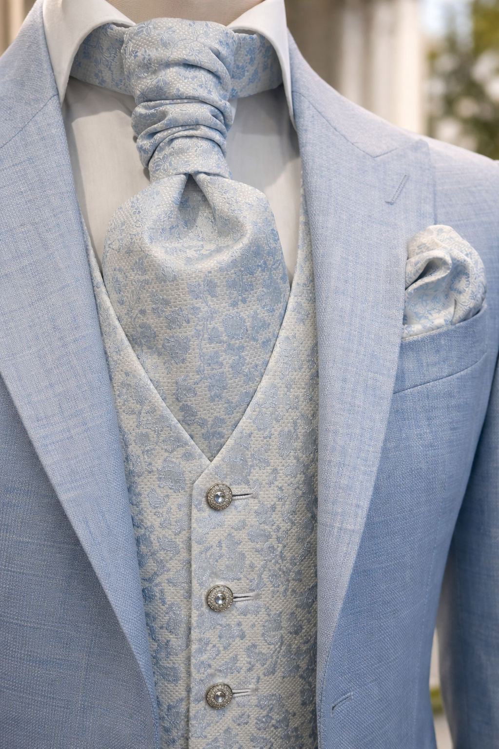 Stijlvol 3-delig lichtblauw trouwkostuum met een crème en lichtblauw bloem gilet en plastron. De sierknopen hebben een strass steentje, het colbert heeft een reverkraag en klepzakken. Mooi voor een voorjaar en zomer bruiloft!