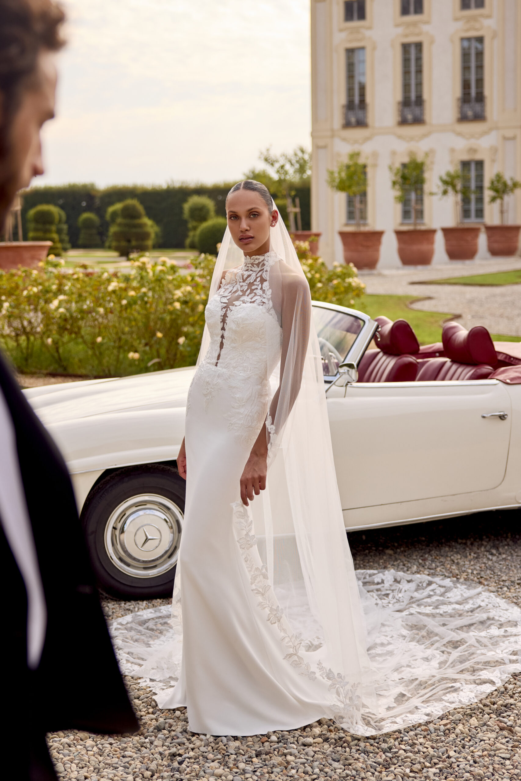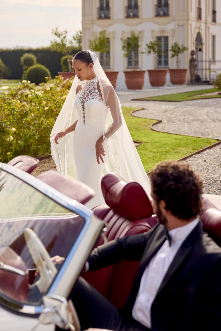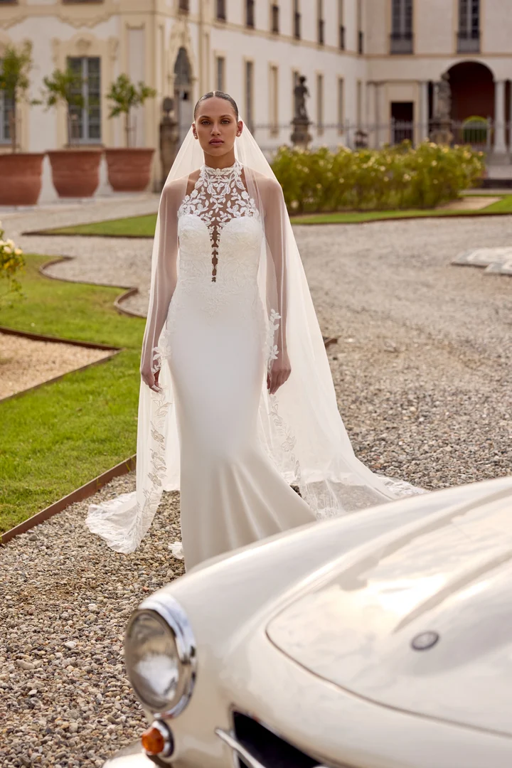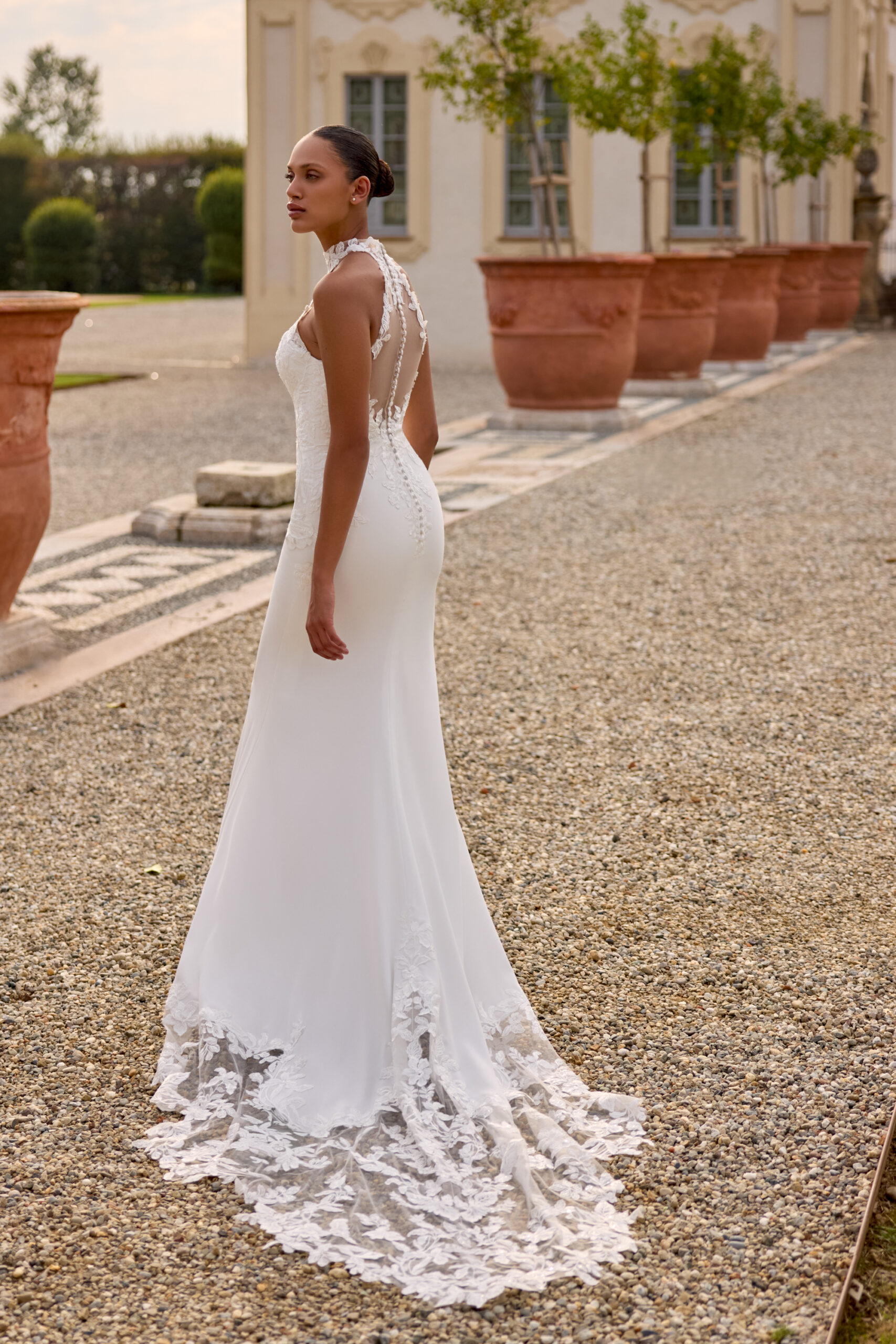 Fit&flare halter jurk gemaakt van Crêpe Georgette. De halter gaat samen met een hoge maar transparante rug met Chantilly kant en knoopjes. De nauwsluitende rok heeft een kapel lengte sleep die mooie kantstukken laat zien! De bijpassende sluier is te bestellen.