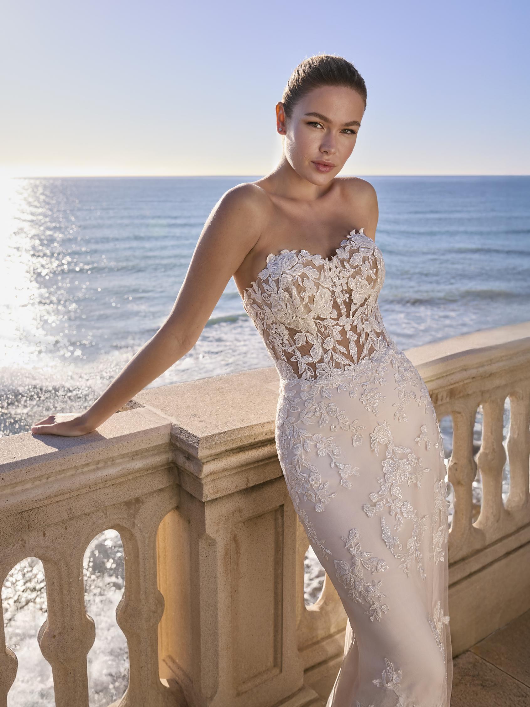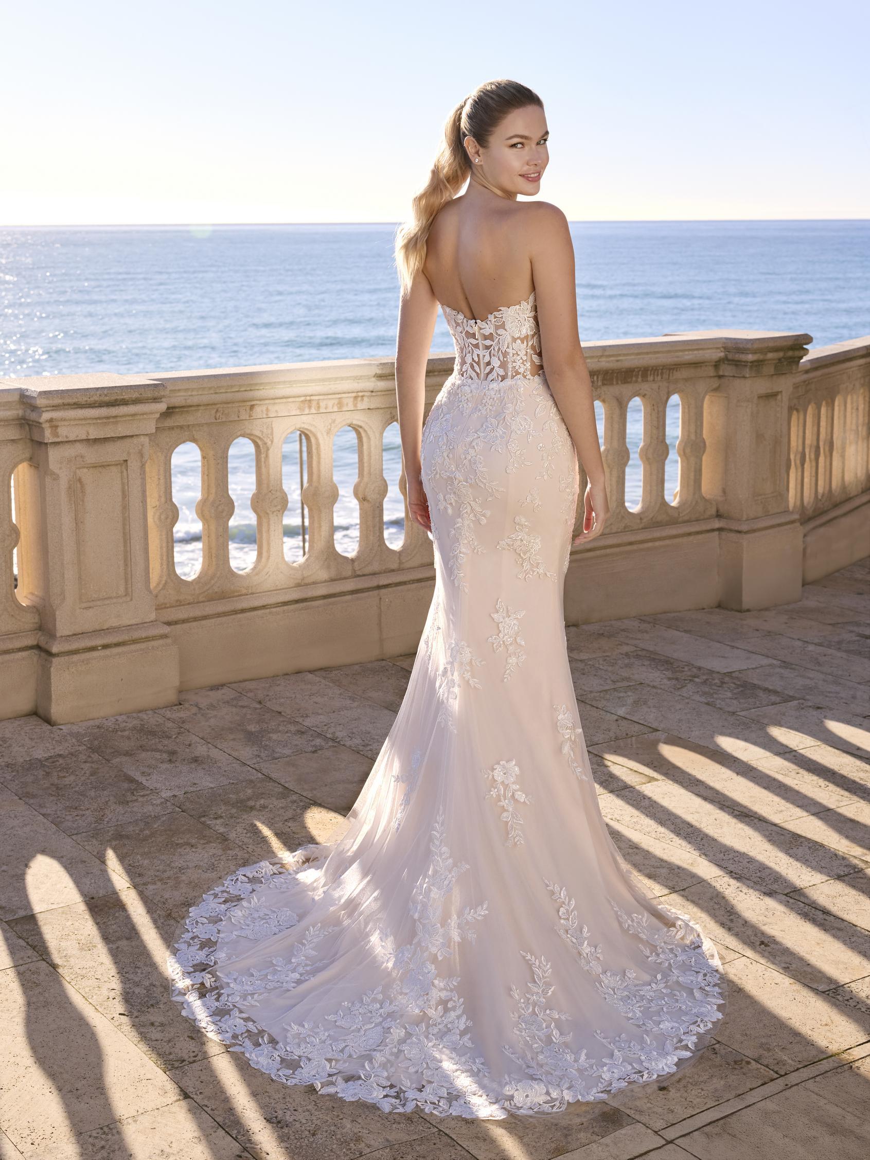 Fit&flair strapless jurk gemaakt van tule en kant applicaties die over de hele rok en sleep zijn verwerkt en die zijn opgewerkt met transparante kraaltjes en lovertjes. De sexy top heeft een zachte Sweetheart halslijn en een wat hoger rechte rug. De opvallend korte ronde sleep draait als vanzelf met je mee.