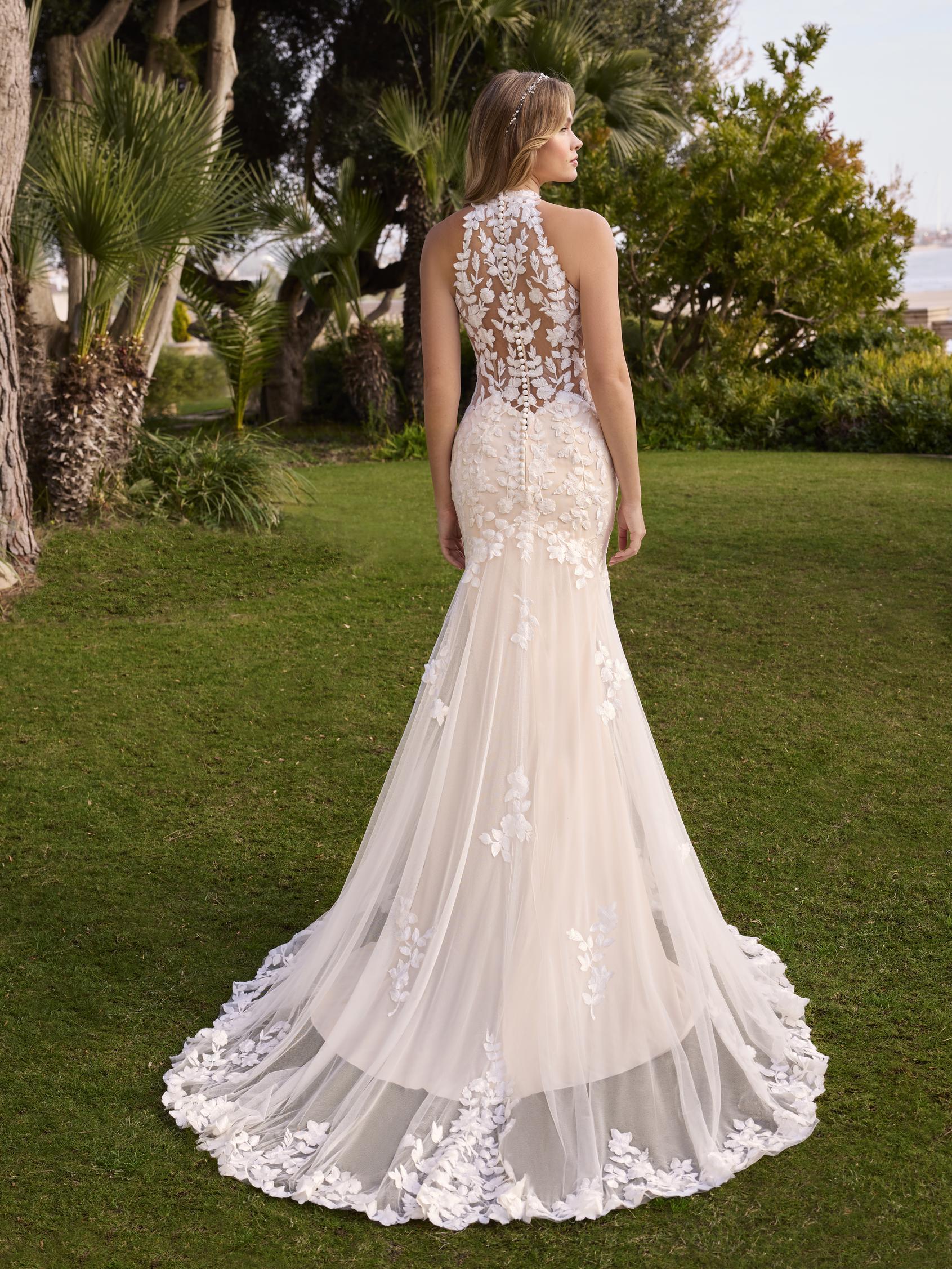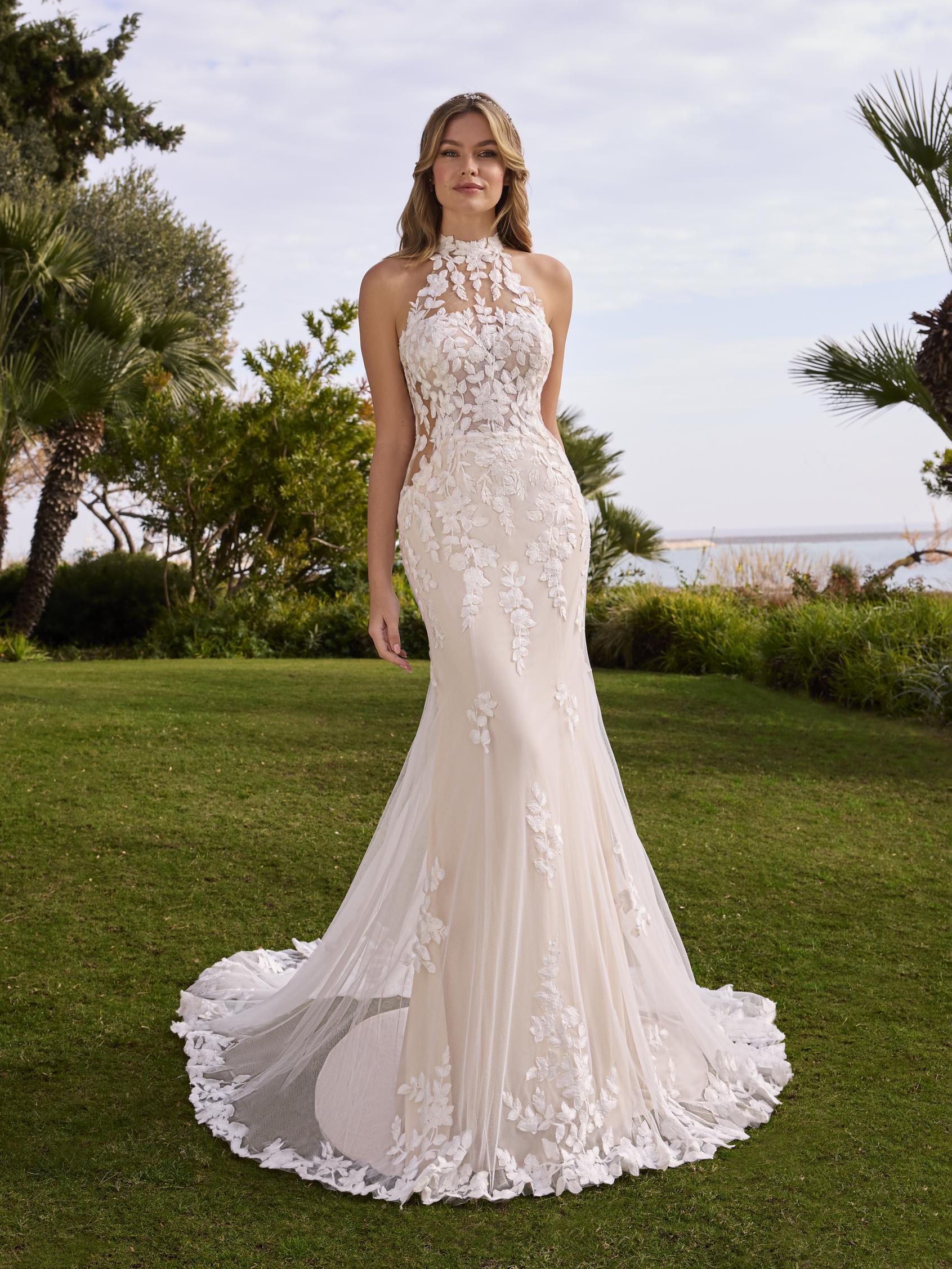 Fit&flair halter bruidsjurk gemaakt van tule en floraal luxe kant dat ook op de rok en sleep terug komt. Het kant is op geen enkele manier versierd, geen glim of glitter! De rug is illusion en loopt in de lijn van de halter. De onderrok valt strakker waardoor er een los beeld ontstaat met de tule rok. Het sleepje begint vanonder de bilpartij en is niet al te lang. Pit, klasse en modieus!