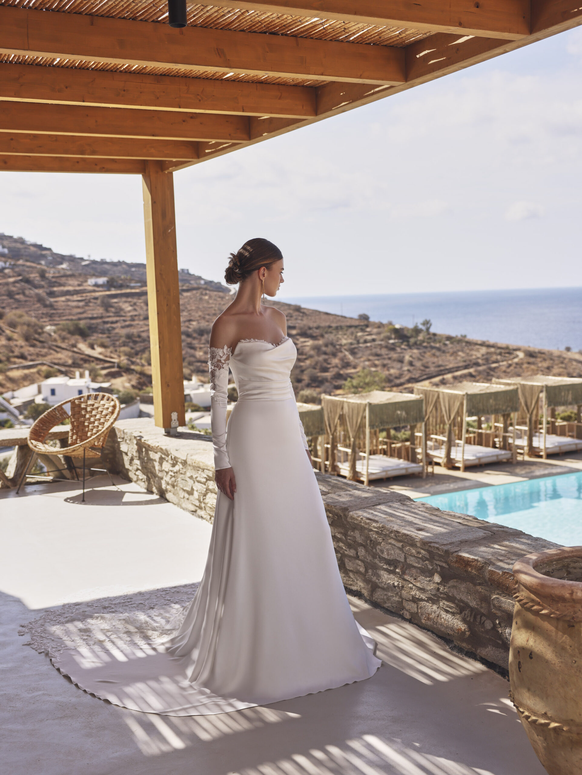 Fit&flare soepel vallende jurk van Satijn, kant en tule. Deze strapless jurk heeft losse mouwen dus hoe leuk om 2 looks te creëren! De achterkant van deze jurk is een eye-catcher op zich door een rug met de ‘corset’ look en de sleep met een inzet van talloze bloemige kantsoorten die heel subtiel een glimmertje hebben.