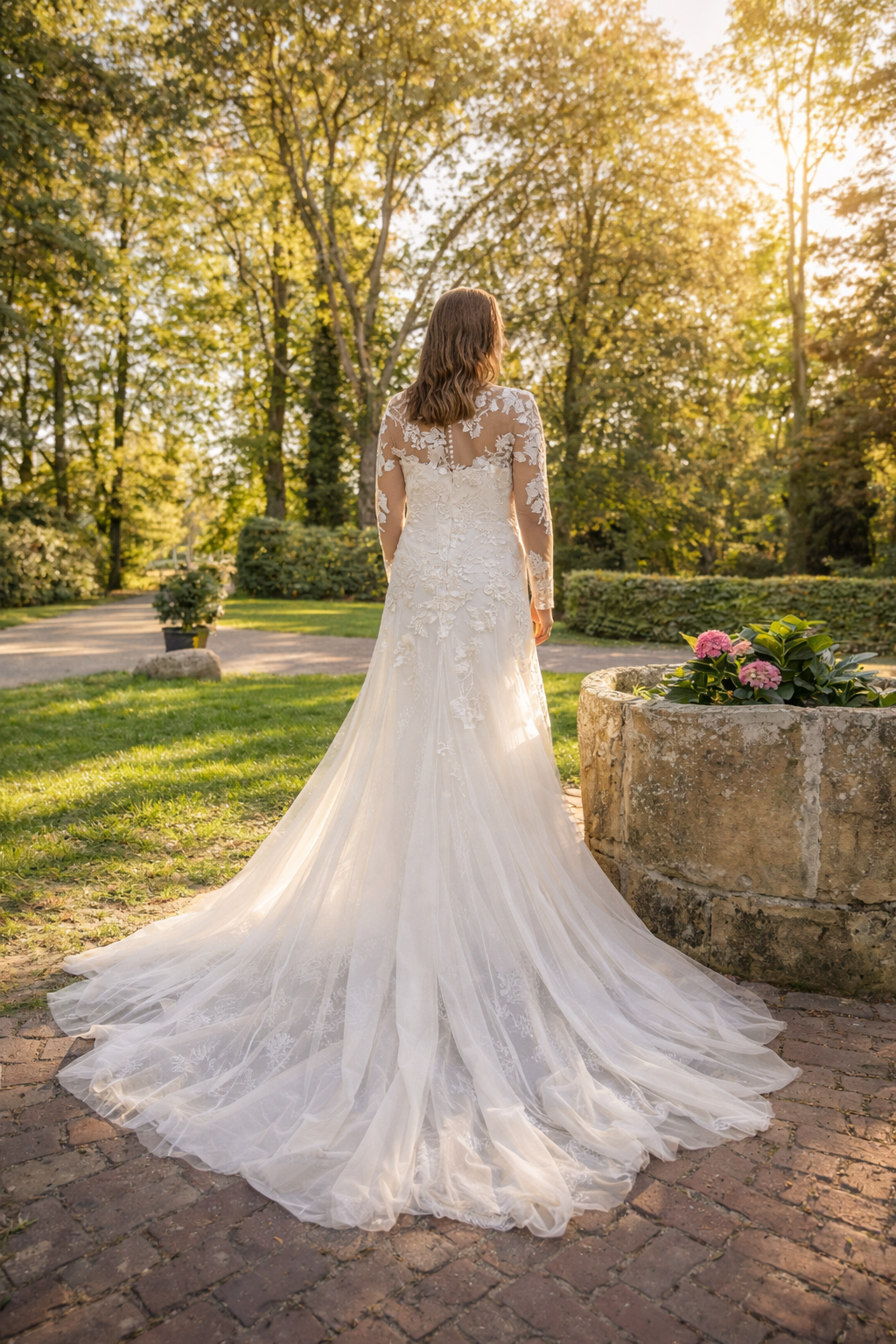 Trouwjurk Modeca Curves Georgia uit de Curves collectie van Modeca heeft een prachtige kanten lijfje met een illusie sweetheart halslijn en lange mouwen bewerkt met kant. Op de rugzijde is een prachtig rugdetail verwerkt en is hooggesloten. De kanten applicaties lopen door in de slanke tule rok eveneens bewerkt met kanten applicaties. Plaatje toch?