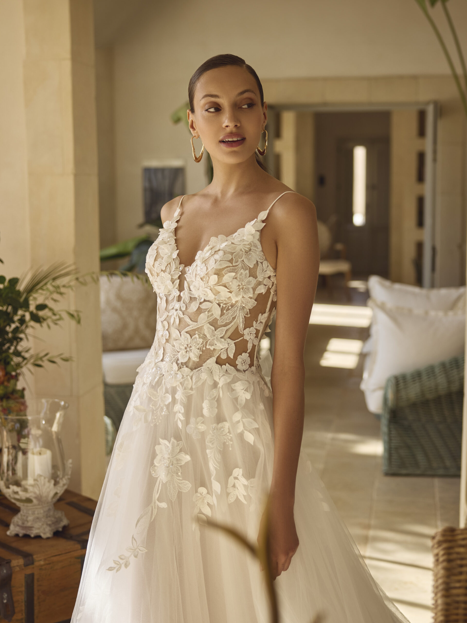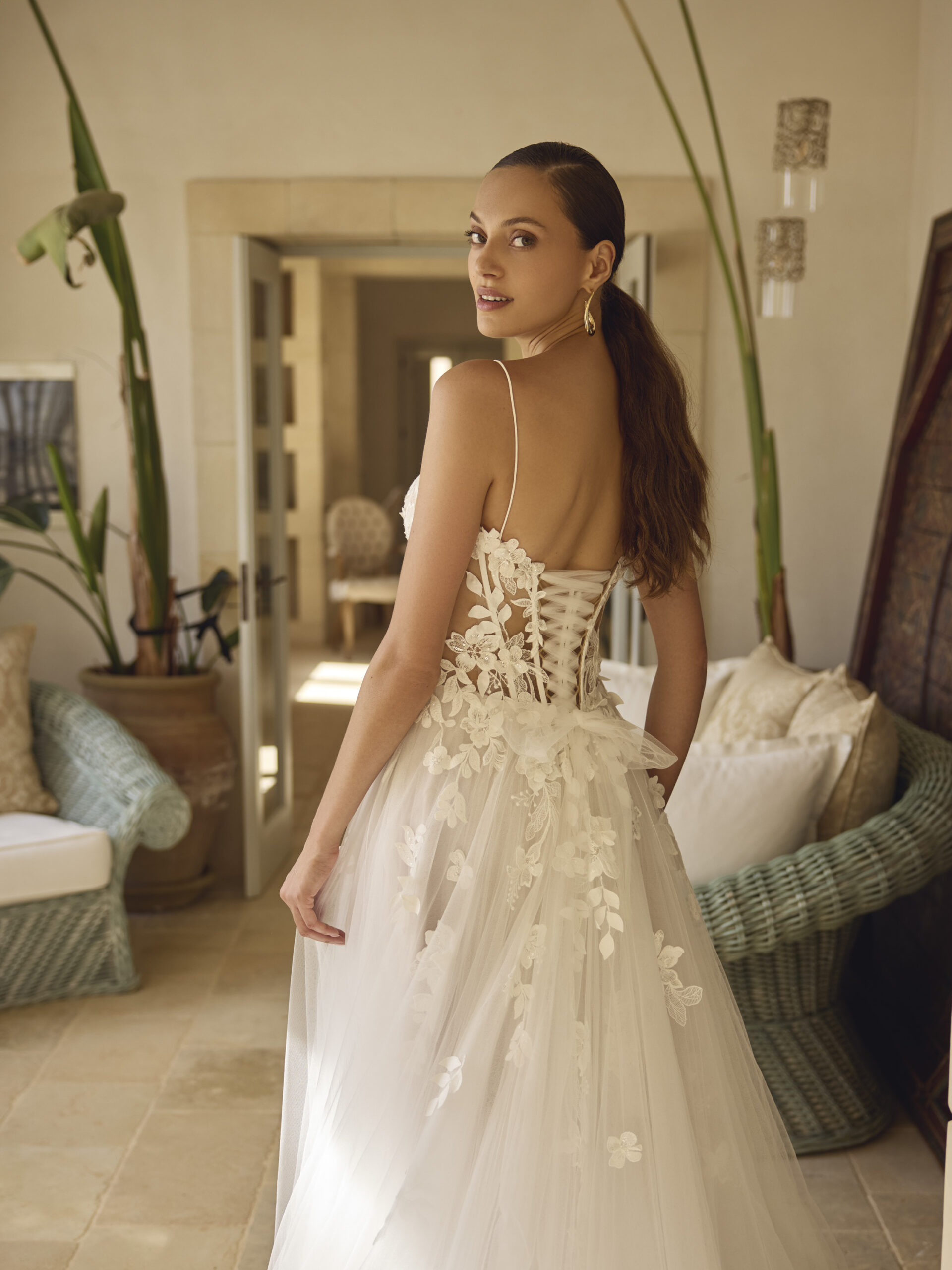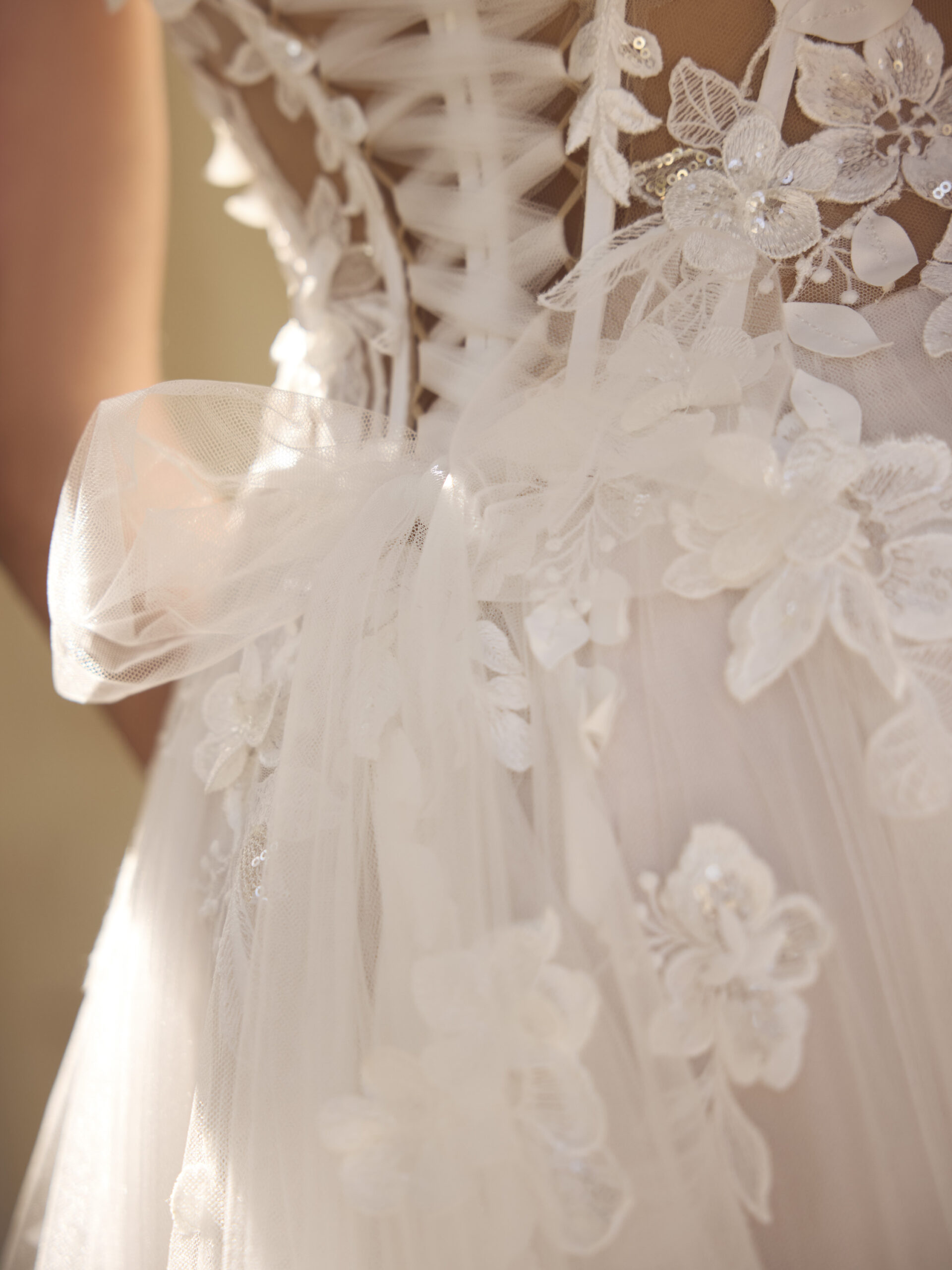 A-lijn jurk met een sexy illusion top waarbij de dunne bandjes gecombineerd zijn met een niet te lage rug dit sluit met een veter! Het lijfje is gemaakt van glitter tule, kant en 3-D bloemetjes versierd met pailletjes. De luchtige maar volle tule rok heeft dezelfde 3-D bloemetjes die speels op de rok zitten. Pikant en romantisch!
