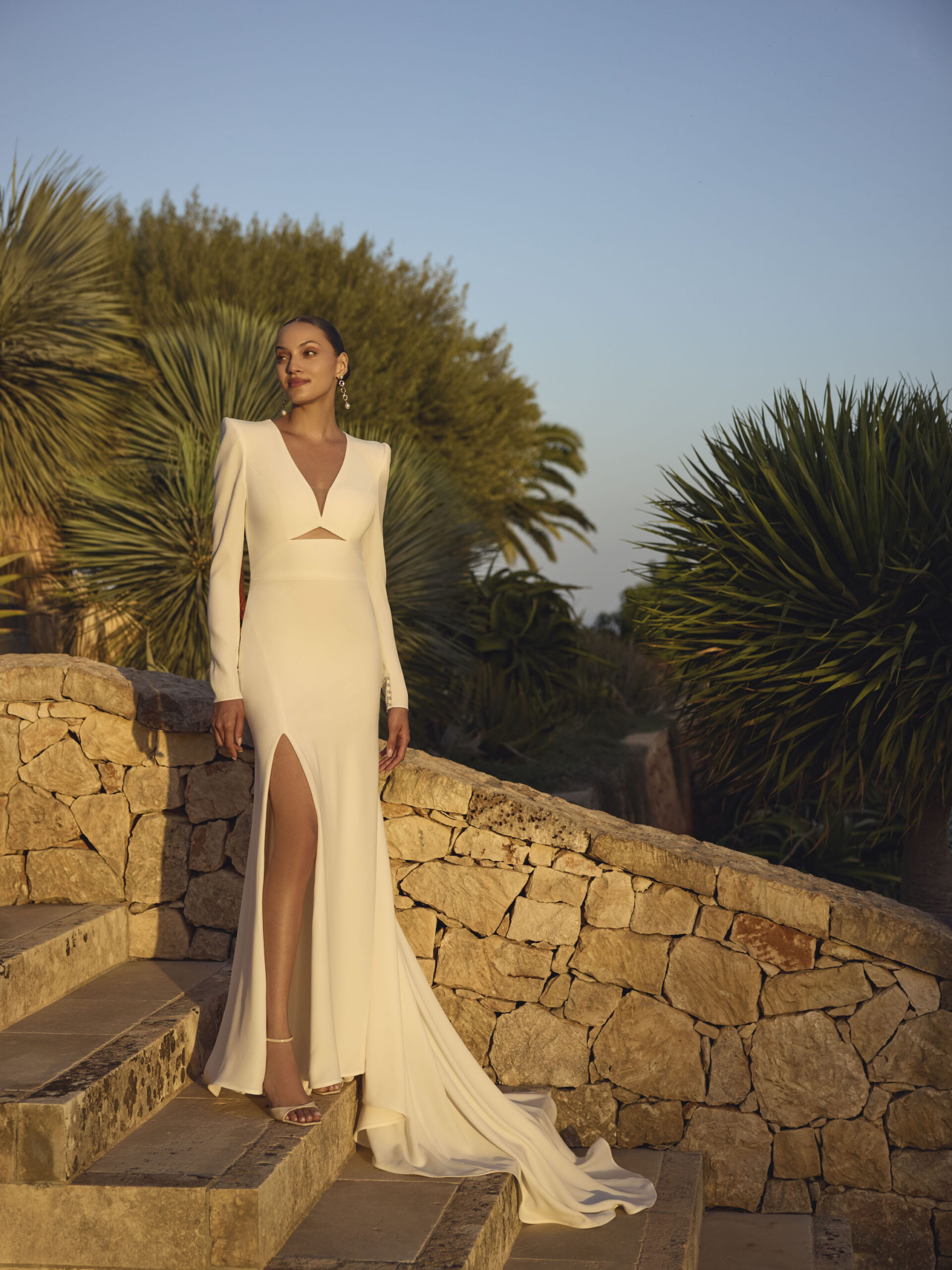 Eenvoudige, stijlvolle slanke fit&flair jurk gemaakt van Charmeuse (crêpe variant) met lange mouwen. De V-hals gaat samen met een key hole rug EN een band. Op de mouwen en in de rug schitteren de strass knoopjes je tegemoet! De rok heeft een split en een sleep. Less is more!