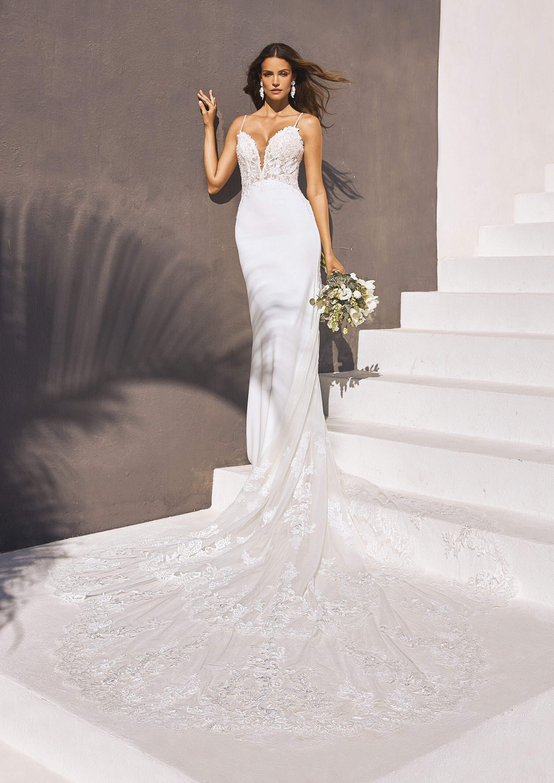 Deze glamoureuze zeemeerminjurk met prachtige kanten sleep van maar liefst 3 meter zorgt 100% voor een verpletterende entree! De rok is van crêpe en het lijfje is van kant met sexy gekruiste bandjes. De taille, heupen en billen bepalen met het kantoorduur voor een ‘stunning” silhouet.