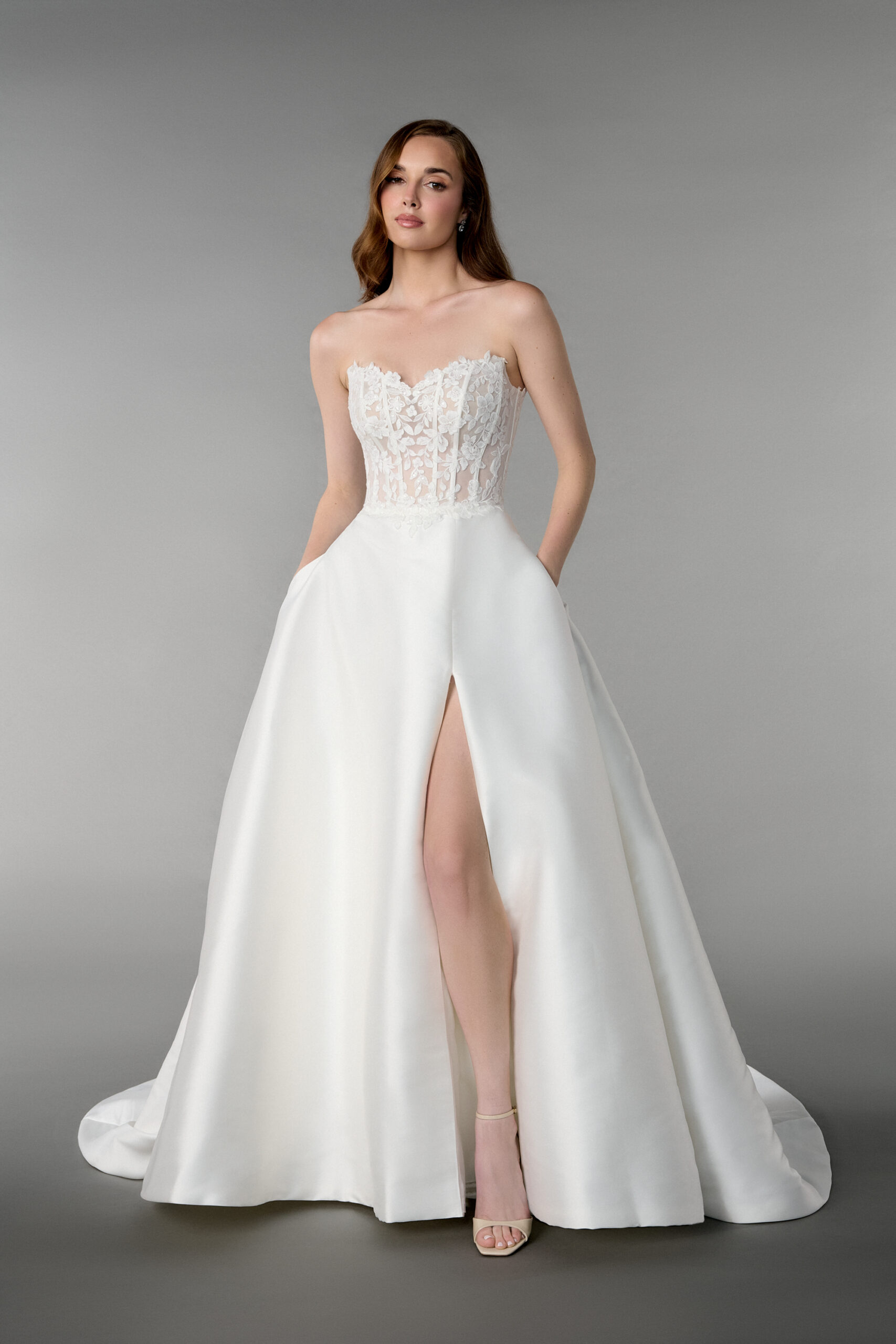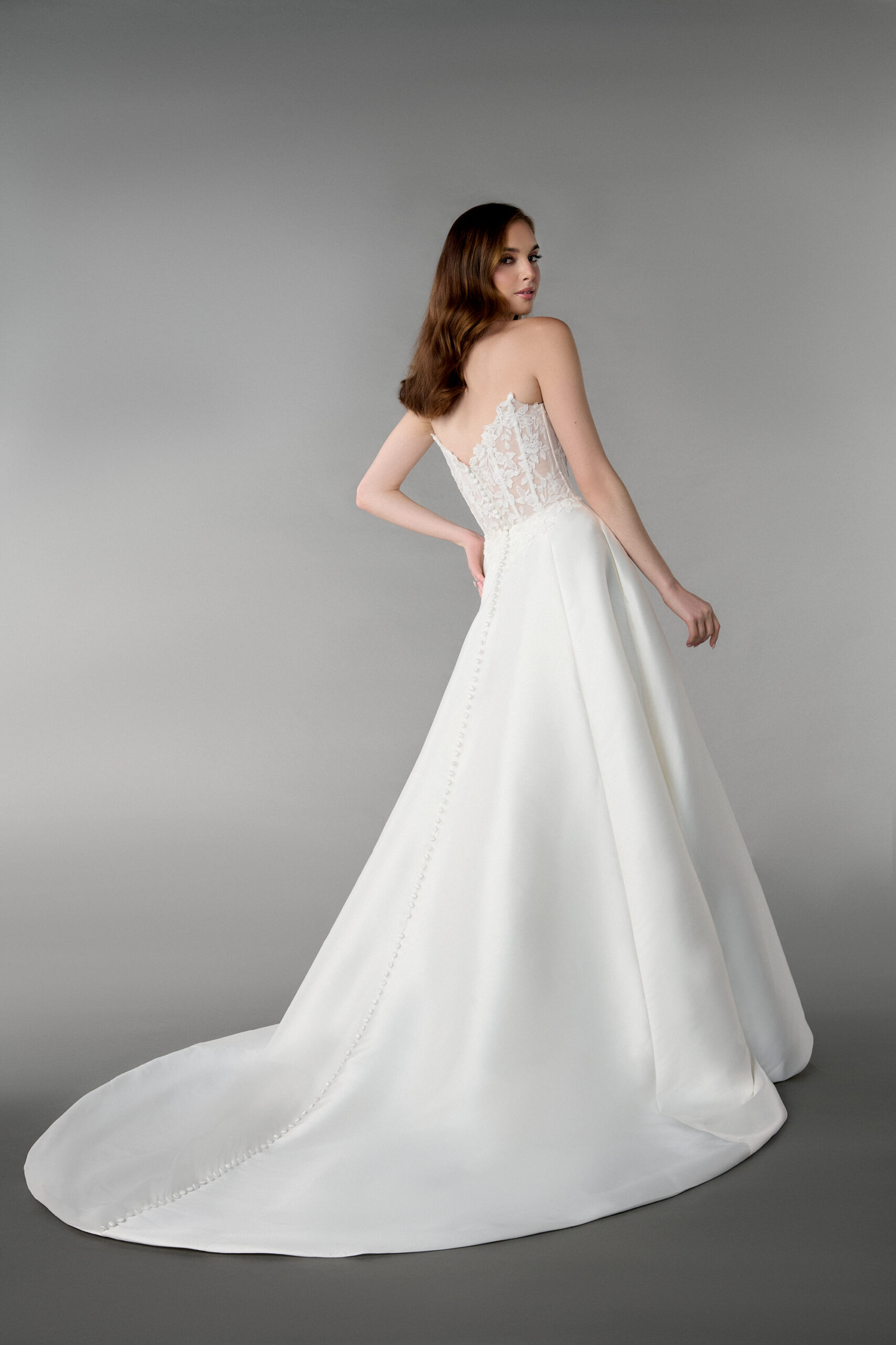 Elegante A-lijn bruidsjurk gemaakt van Mikado zijde en een rijk bewerkt lijfje van Engels kant versierd met pailletjes. De Sweetheart strapless top heeft zichtbare baleinen en de rug is in een lage V gesneden. De jurk sluit met knoopjes die doorlopen over de sleep. Ons model heeft geen split.